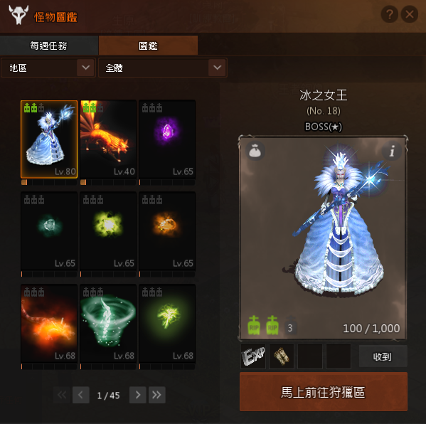 當在遊戲內擊殺怪物達一定次數時,系統會登錄怪物圖鑑內容