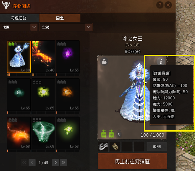 點選怪物右上方的[i],會顯示怪物的詳細資訊