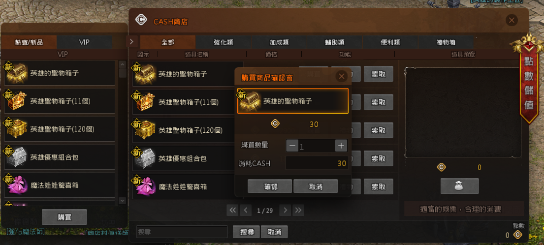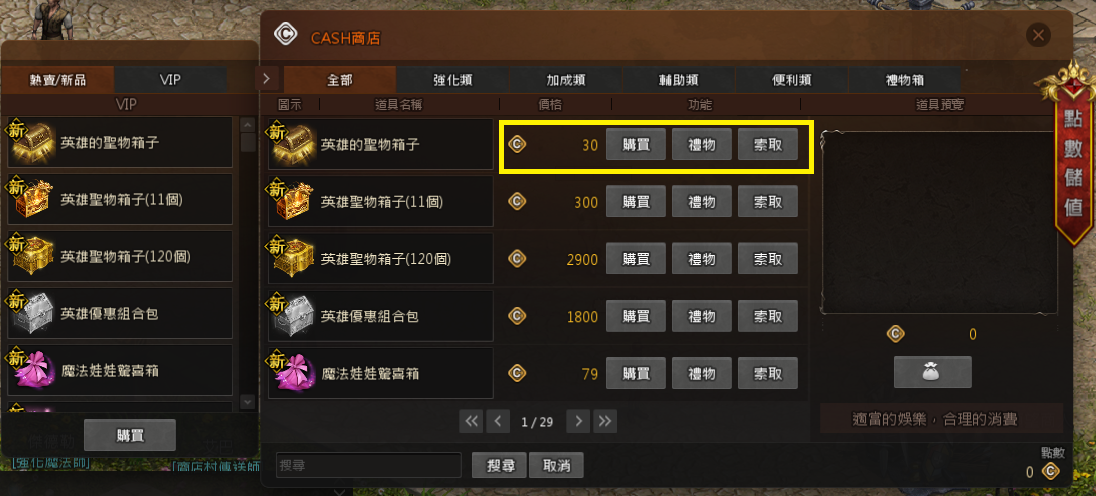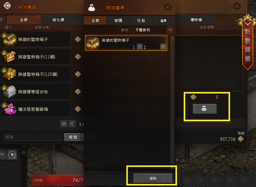 購買完畢後,可以點選右方的袋子圖案,進入商城保管箱,選擇要領取的道具,