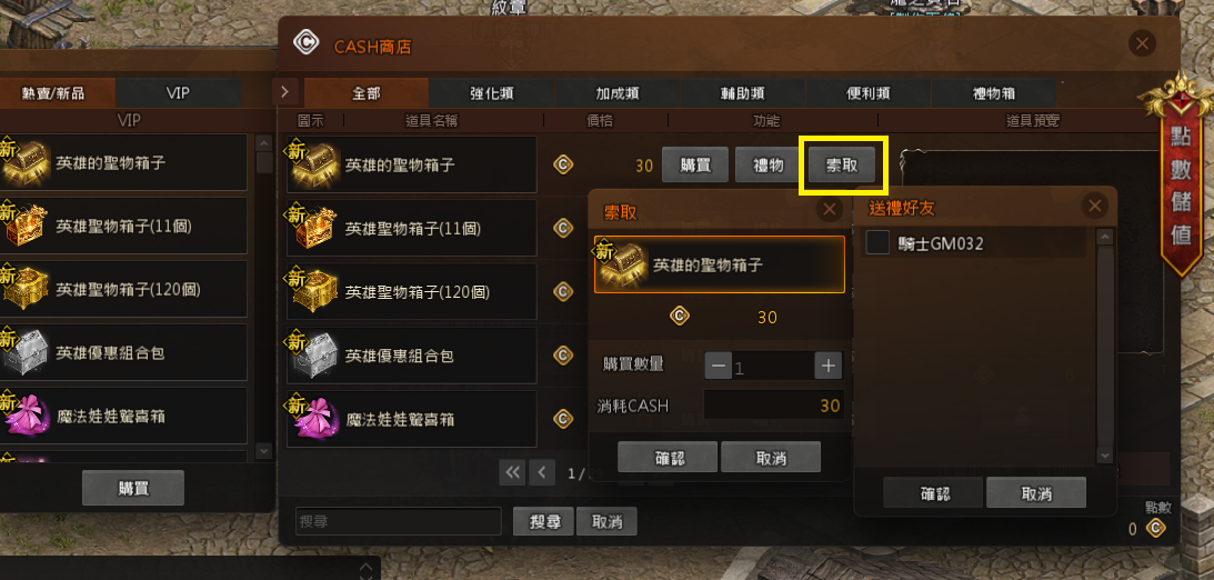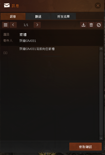 點選[索取]按鍵,可以向[好友名單]中的玩家索取禮物